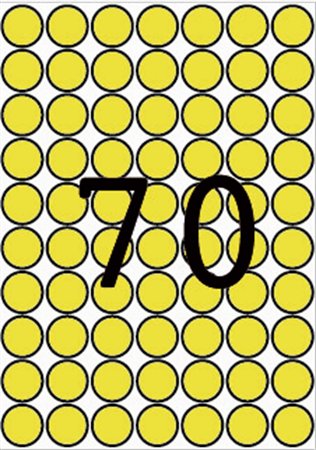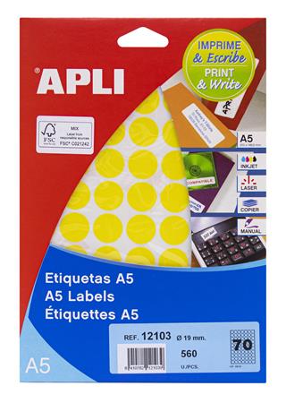 Etikety, okrúhle, priemer: 19 mm, farebné, na liste formátu A5, APLI, žlté, 560 etikiet/bal