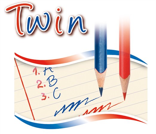 obojstranné ceruzky: čerený a modrý hrot na opačných koncoch, nevygumovateľná farba, ideálna voľba pri učení, nelámavý, 100% lepený hrot, hrúbka grafitovej tuhy: 3 mm ("TWIN") a 5 mm ("TWIN JUMBO"), 1ks/bal