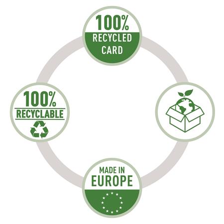 Vysoko kvalitný ekologický pákový šanón vyrobený zo 100% recyklovaného a 100% recyklovateľného kartónu s uhlíkovo neutrálnymi certifikátmi, FSC a Blue Angel.